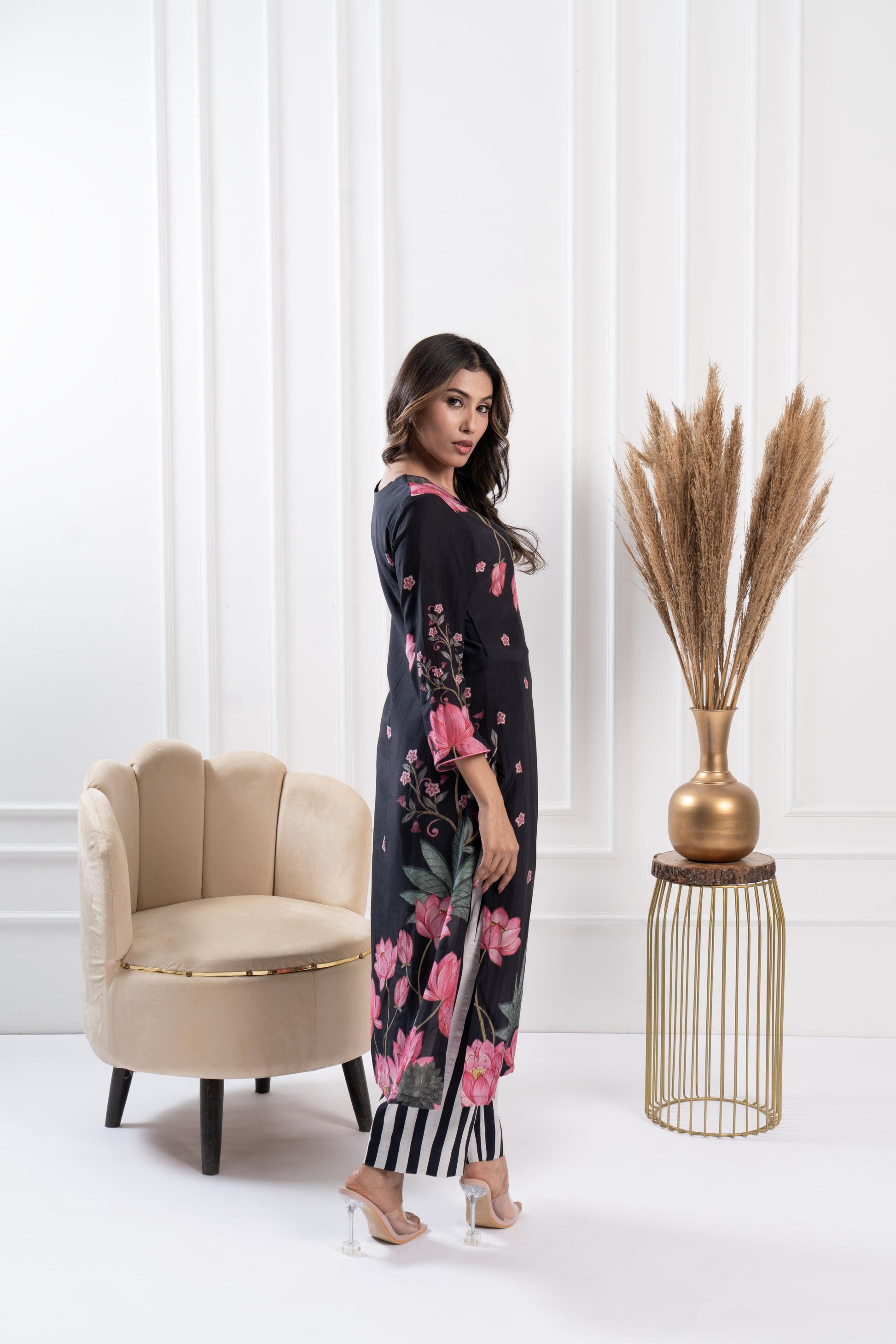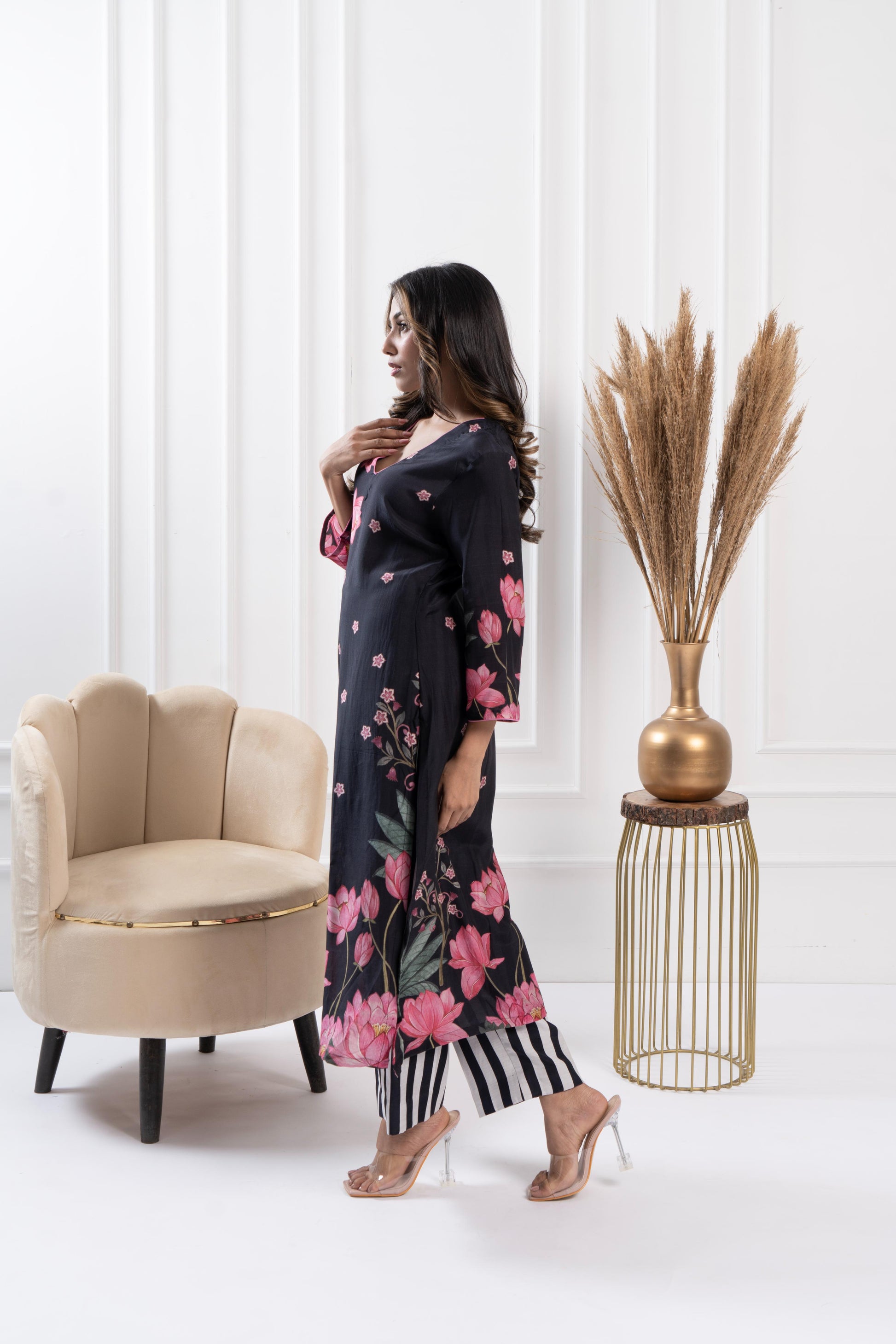 Straight-cut kurta featuring an elegant placement print, paired with coordinating striped pants for a chic and contemporary look.