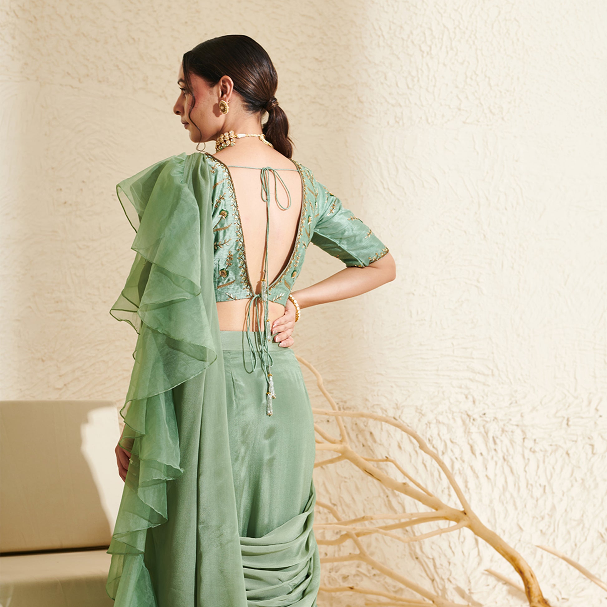 Elegant organza ruffle saree paired with a V-neck blouse, elbow sleeves, deep back, dori tassels, and delicate hand embroidery in golden and green sequins.