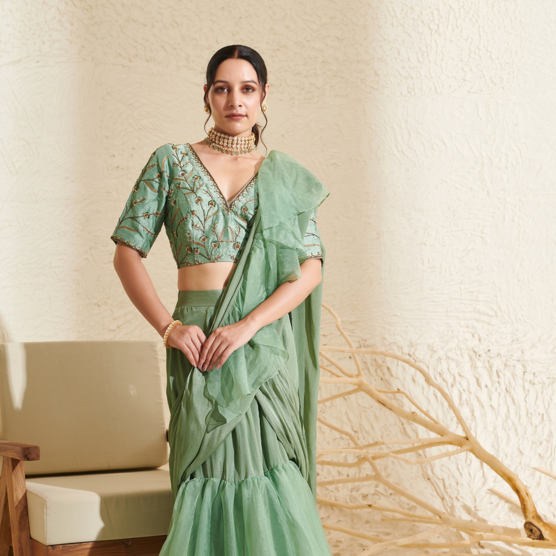 Sage Organza Ruffle Saree