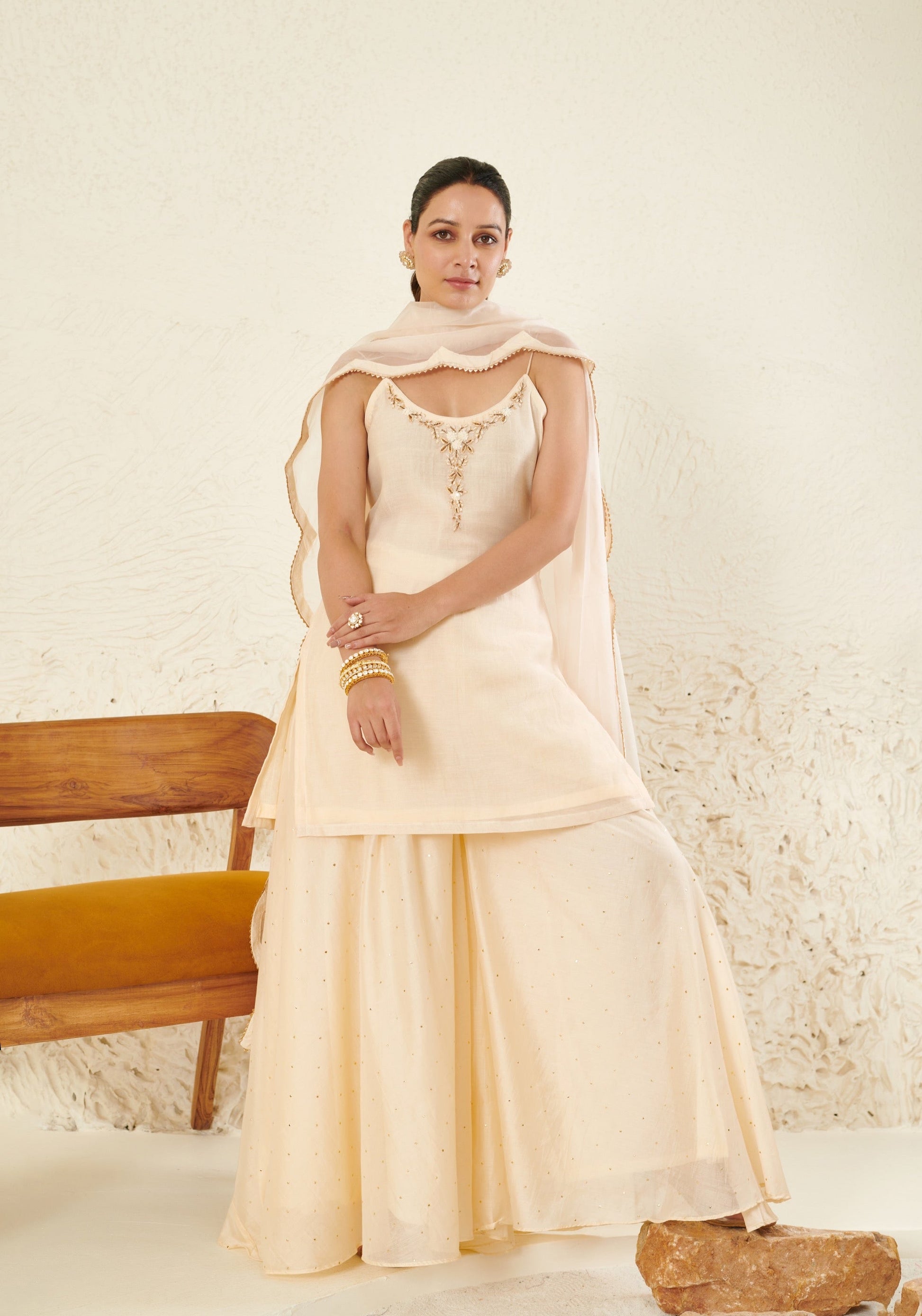 Elevate your style with our luxurious Heer Ivory Garara Set featuring delicate hand embroidery, sequins, pearls, and threadwork on the neck. The all-over Mukesh work on the garara and the big scalloped organza dupatta with gota border add an exclusive touch. The elastic waistband ensures comfort without compromising on elegance.