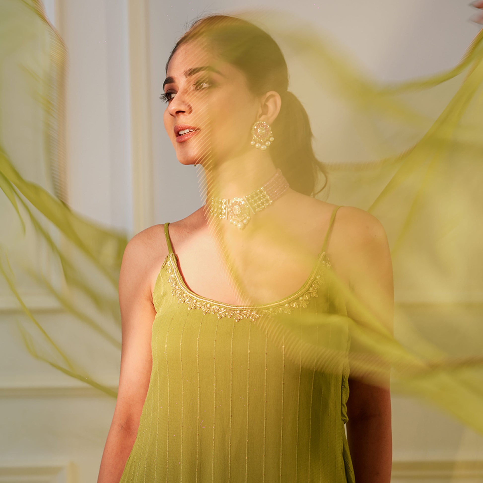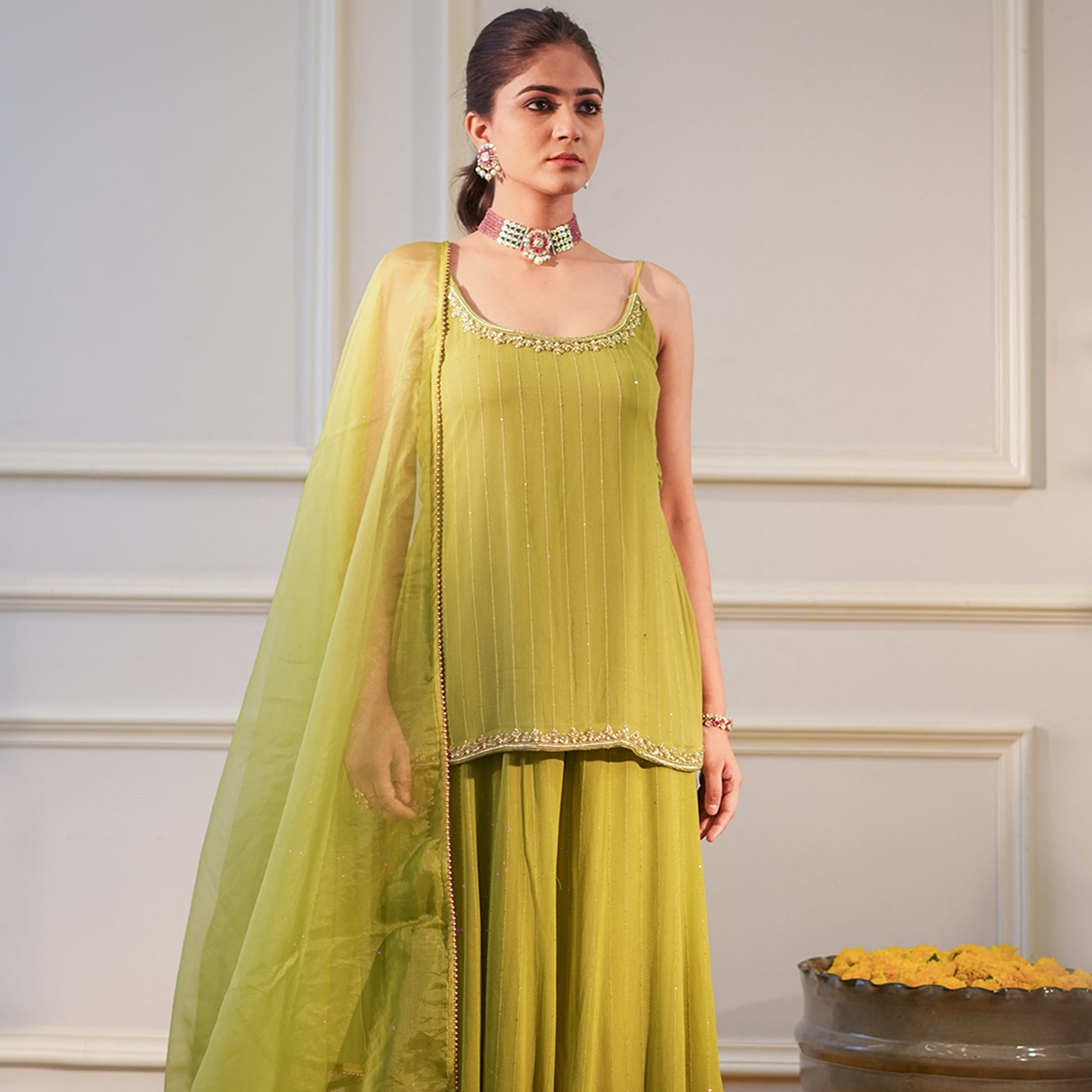 Glamorous sequins georgette garara set featuring a flared garara and embroidered neckline kurta, paired with a sheer organza dupatta.