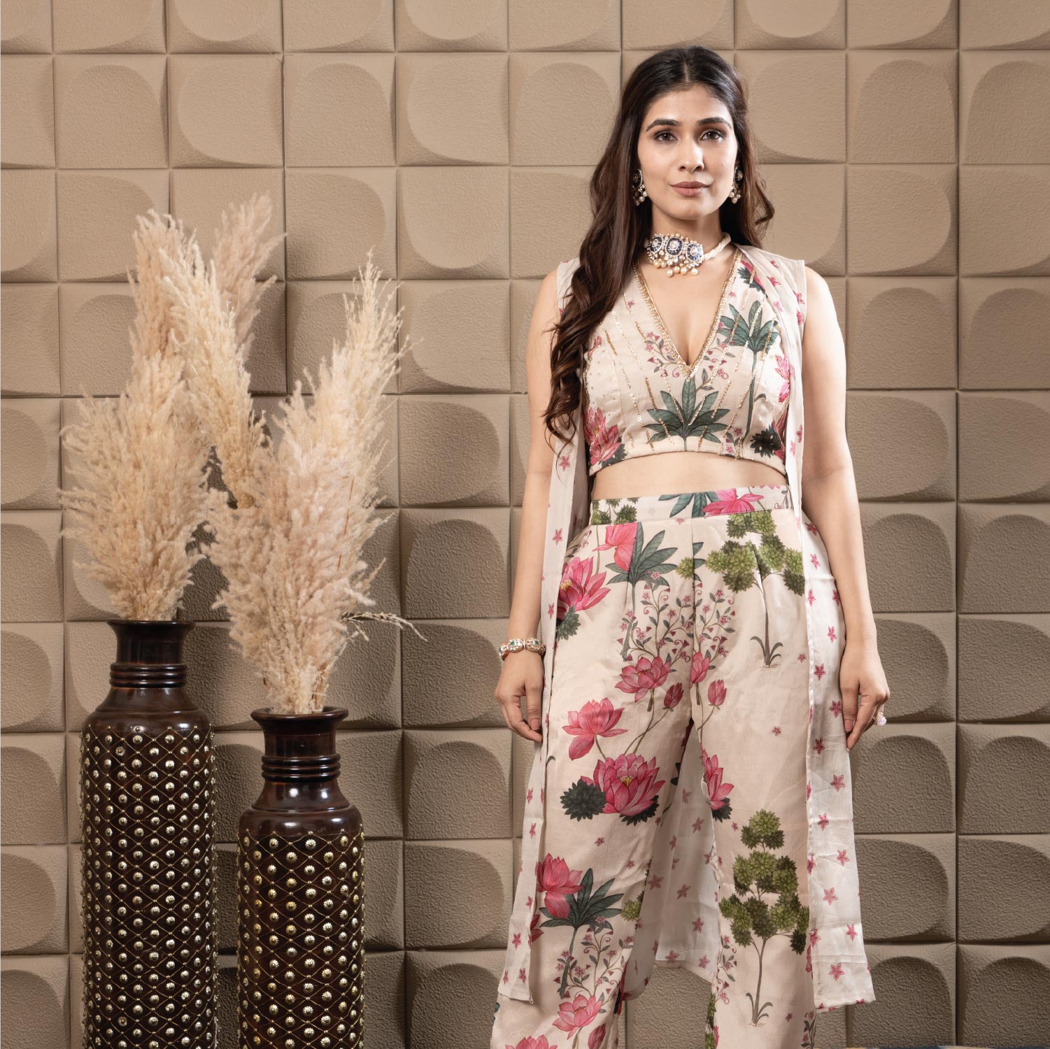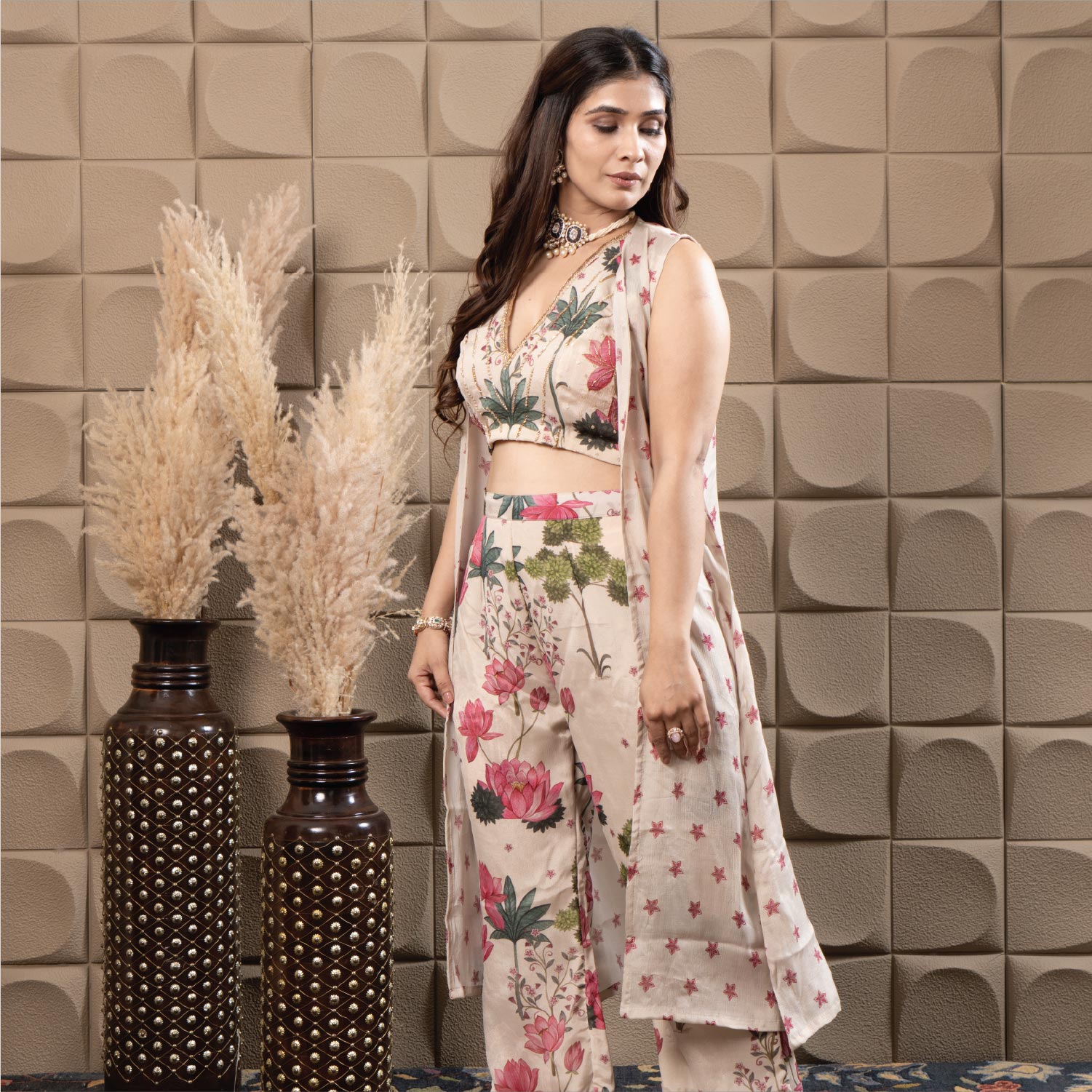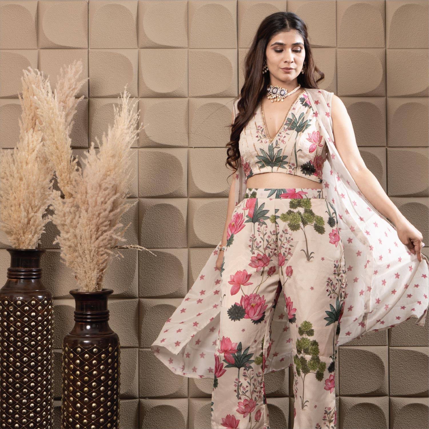 Chiffon flared pants paired with a Flowing printed Chiffon Cape, styled with a stunning top Embellished with intricate sequence and cut-dana Embroidery, Creating a contemporary yet Elegant ensemble perfect for festive occasions.