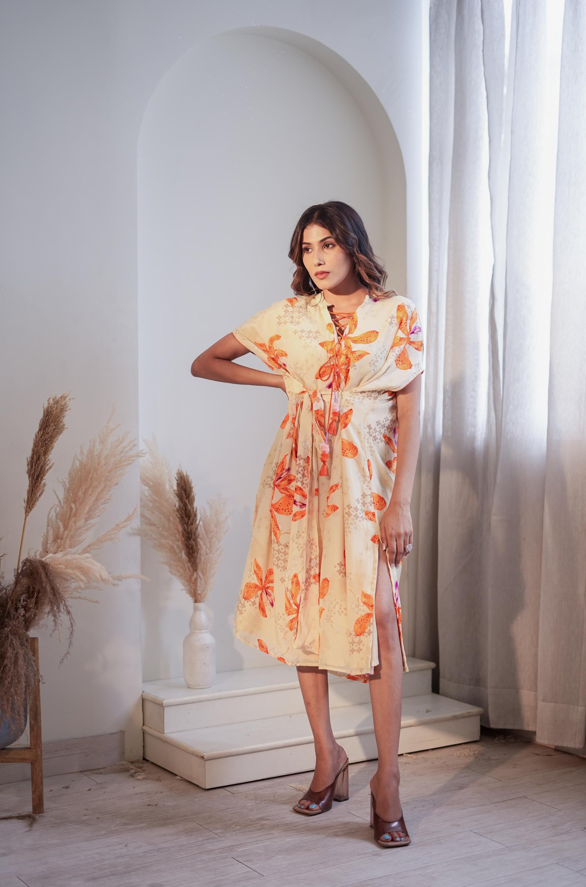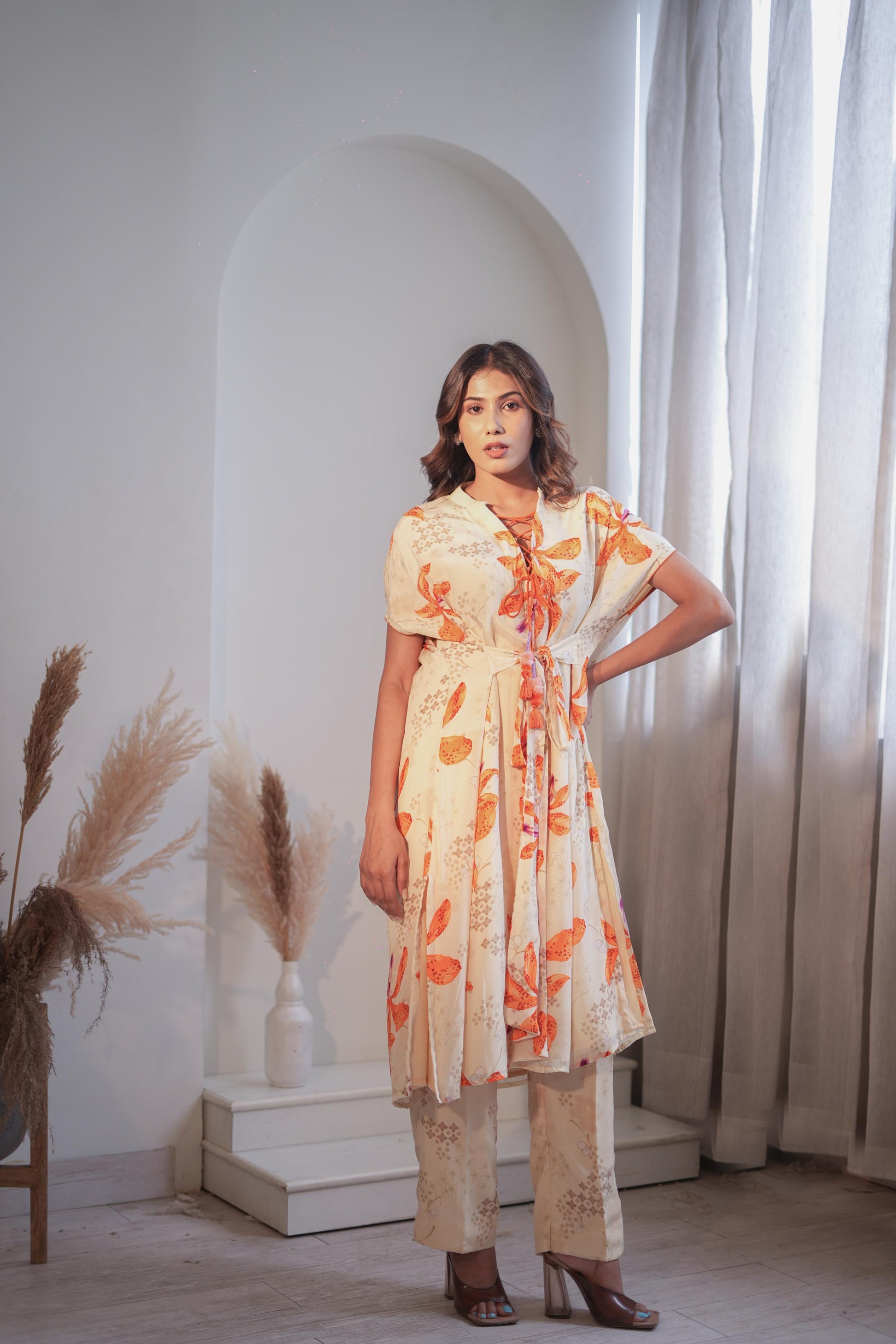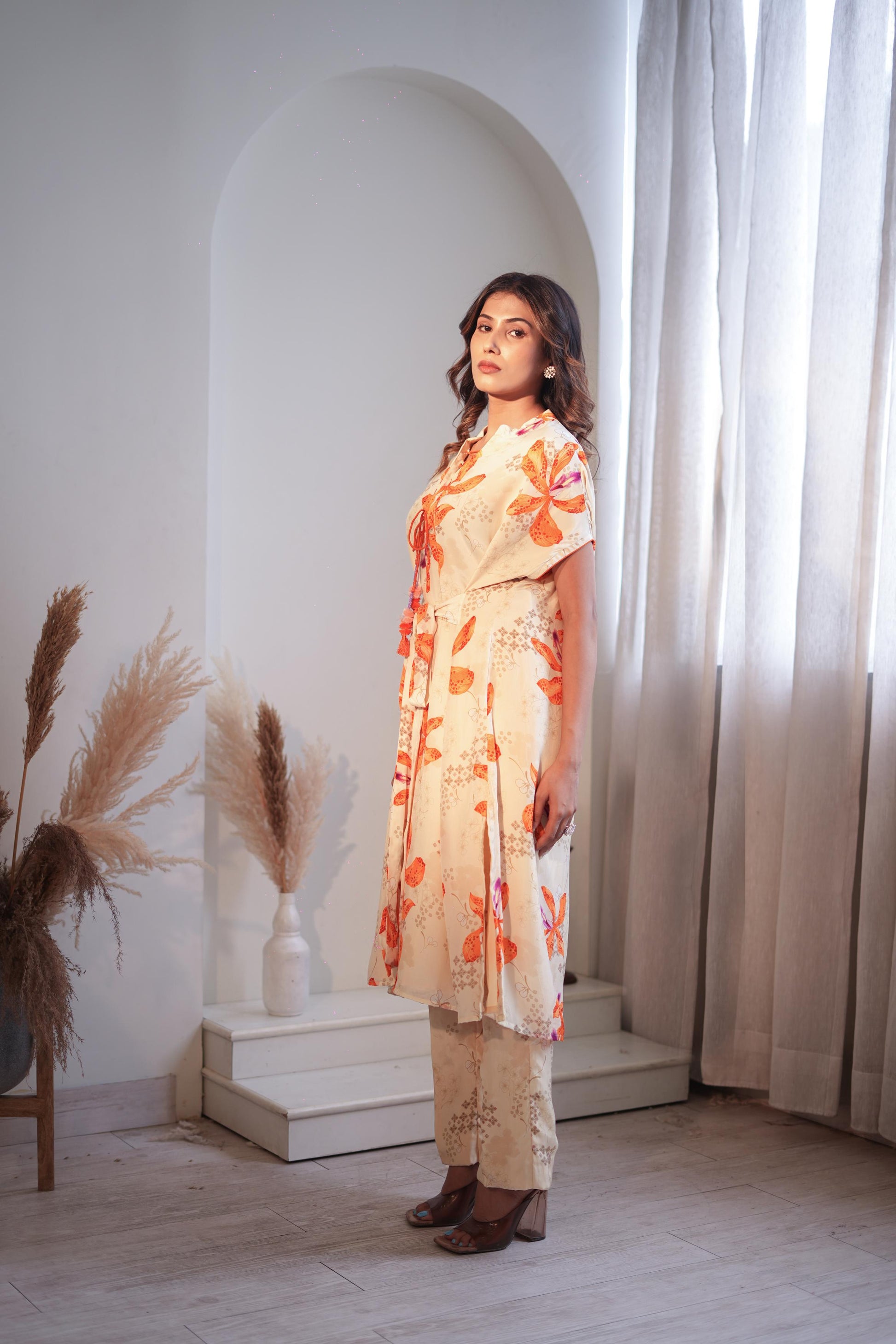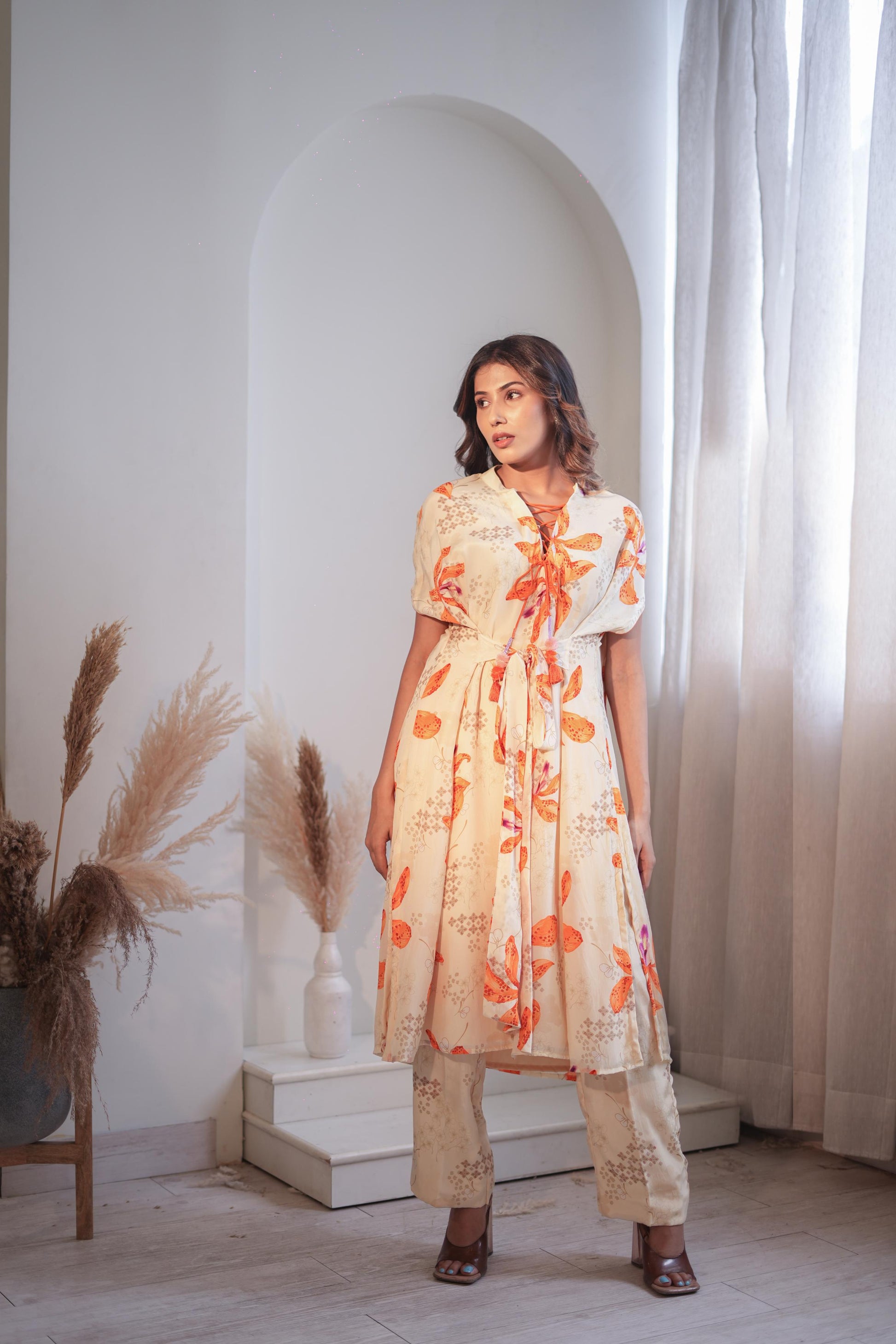 A stylish kurta with side slits and tie-up belt creates a flattering silhouette. It blends traditional elegance with modern fashion, offering comfort, movement, and a chic structured look.