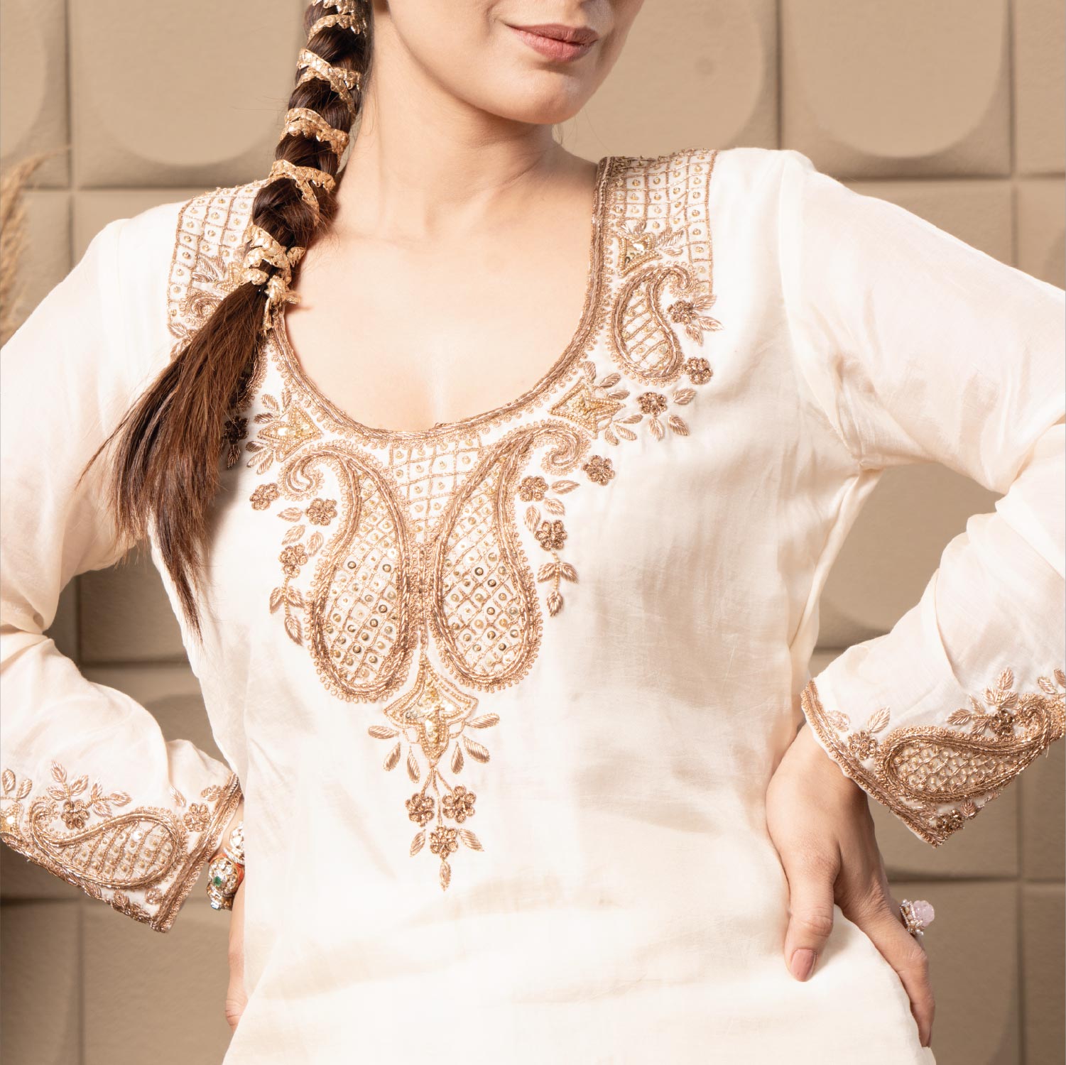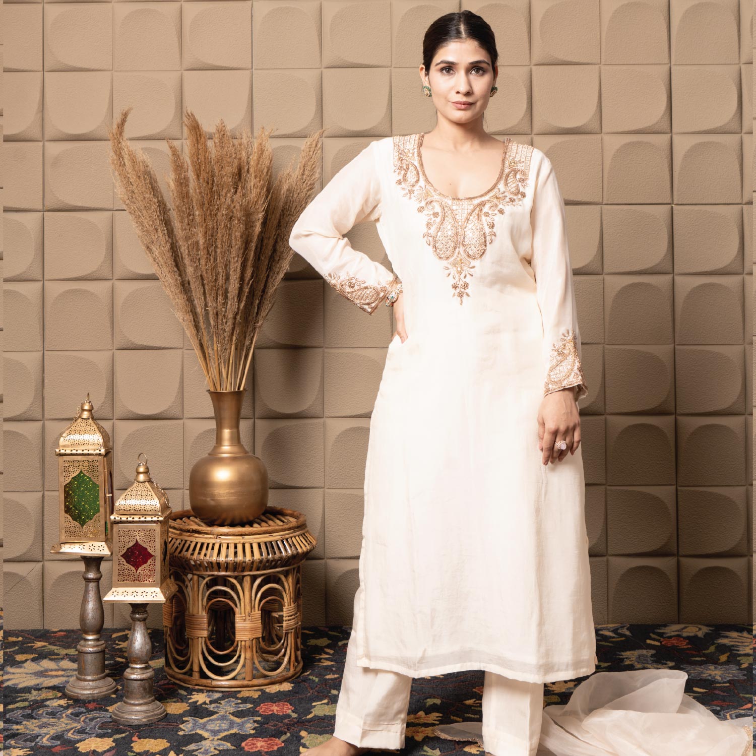 Classic straight kurta set adorned with intricate embroidery on the neckline and sleeves, paired with graceful dupatta for an elegant, timeless look.