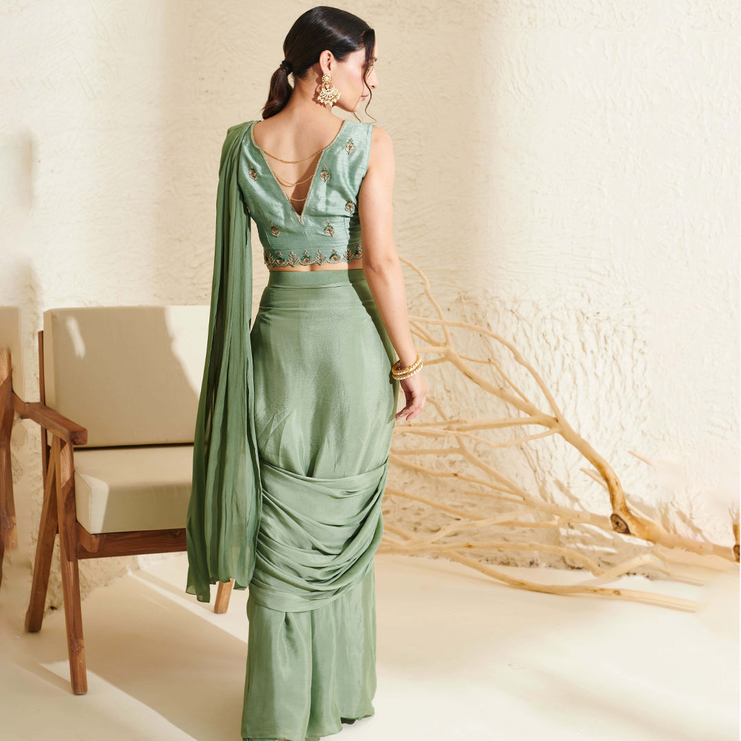 Sage pleated saree paired with a scallop V-neck sleeveless blouse, delicately hand embroidered with green and gold sequins, beads, pearl and shimmering golden thread detailing.