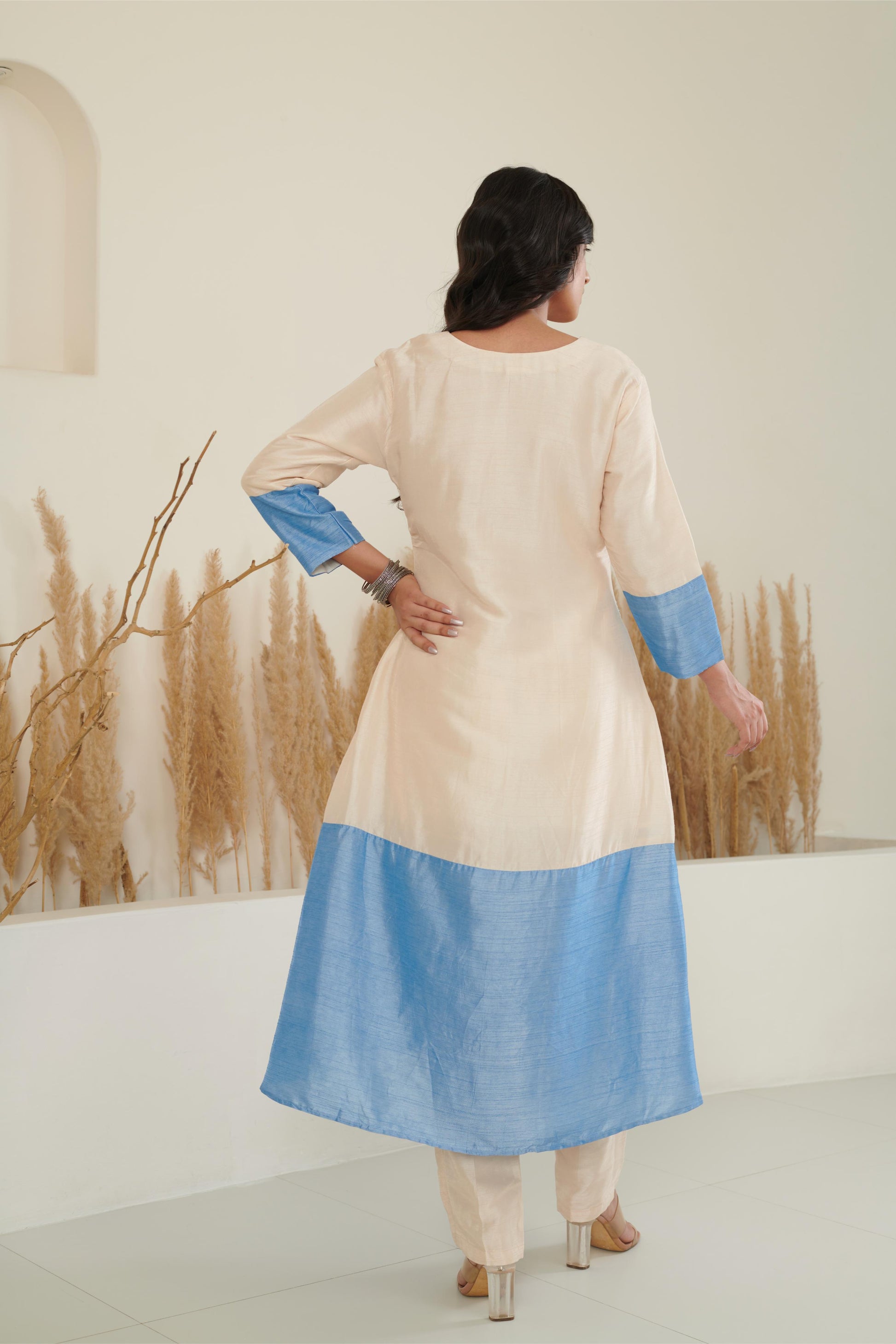 Sol Colour Block Kurta Set - Ivory/Blue